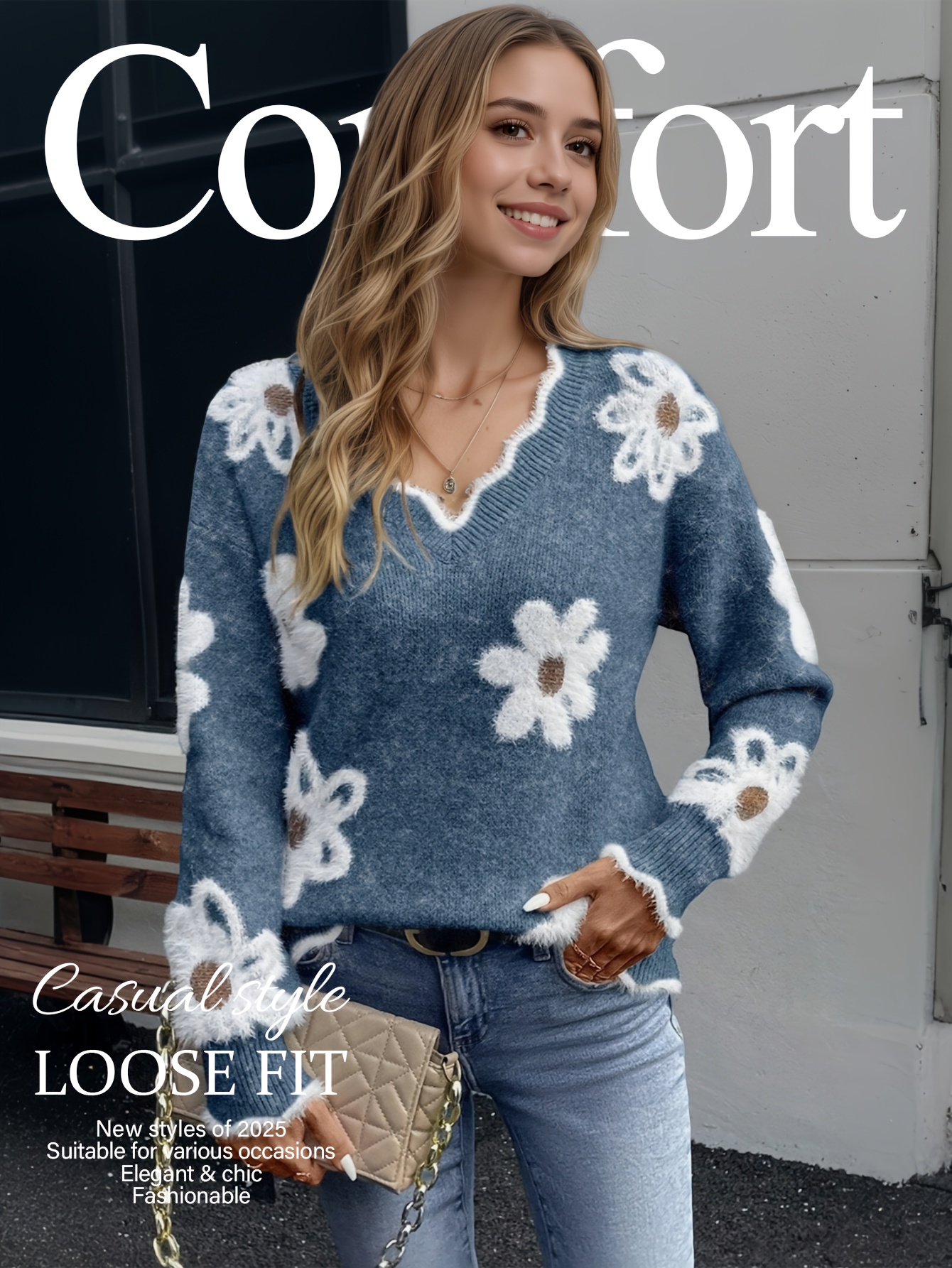 Block Long-Sleeve Sweater, Warm and Gentle with Plush Flower Prints and Lace V-Neck, Gentle Lazy and Sweet Fashionable and Elegant, Blue Color, Best-Selling Item on Pre-Order