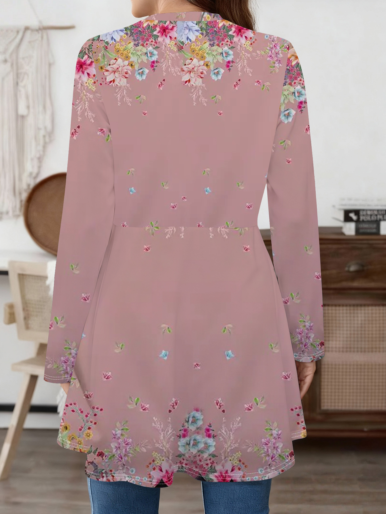 Plus Size - Plus Size, Plus Size Women'S Elegant Floral Print Cardigan - Lightweight Breathable Stretchy Long Sleeve Open Front Sweater with Pastel Pink & Multicolor Floral Design, Spring/Autumn Casual Outerwear for Women