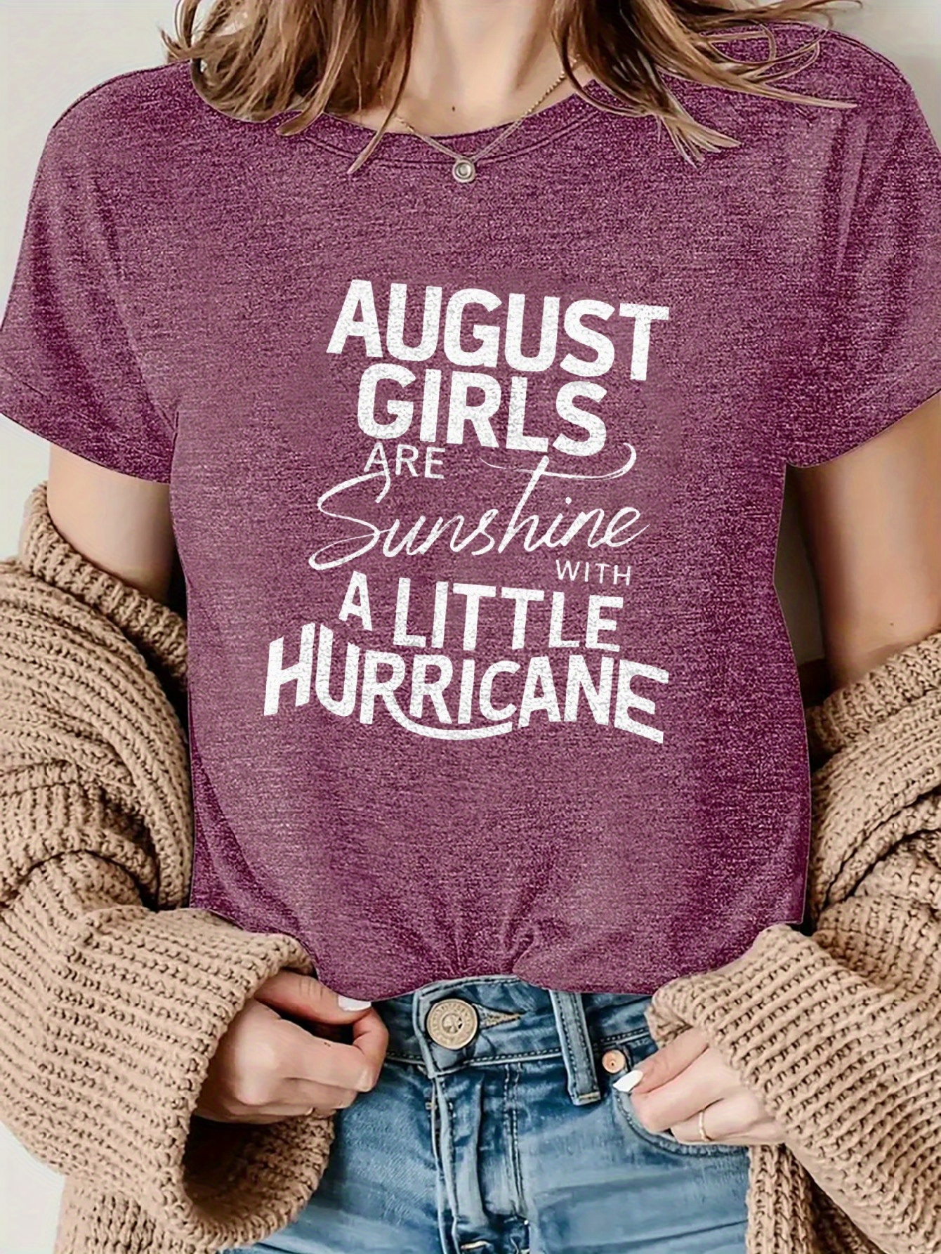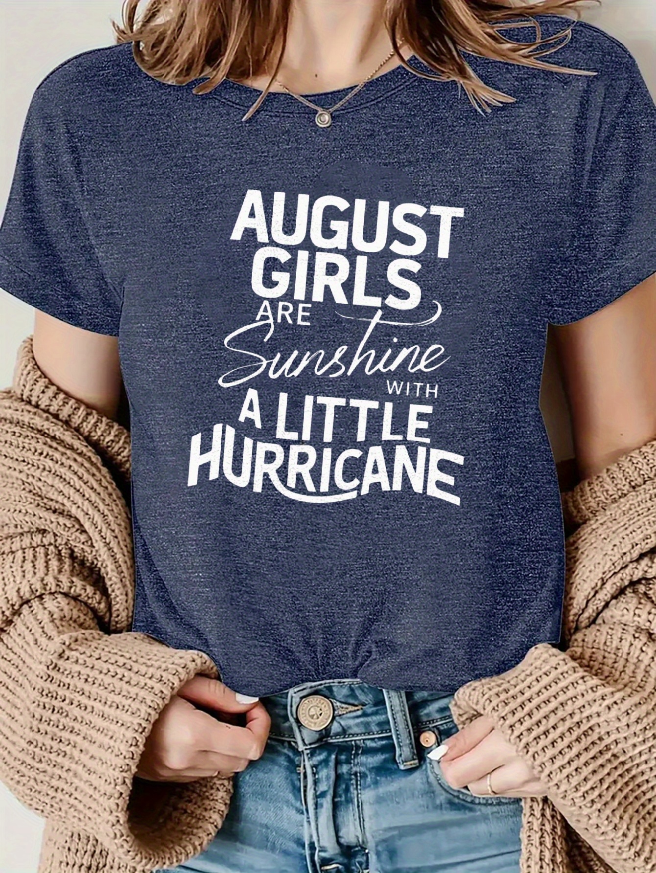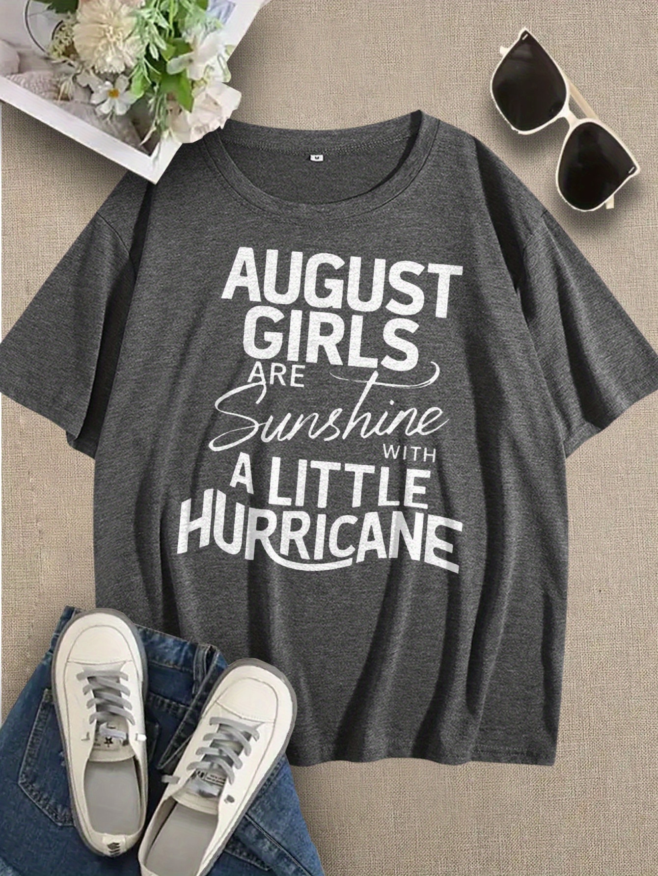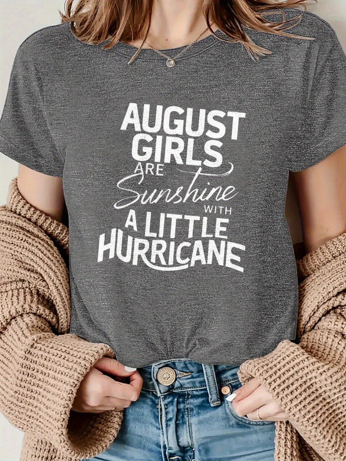 [August Sunshine T-Shirt] Women's August Sunshine & Hurricane Quote T-Shirt - Dark Grey with White Text - Breathable Everyday Summer Tee - Birthday Outfit Idea - Machine Washable Casual Streetwear Top, Graphic Text Shirt, Comfortable Fabric