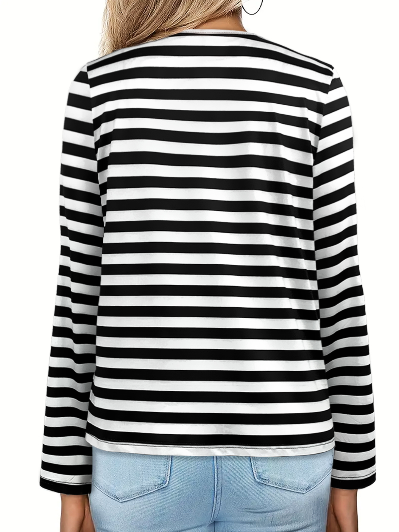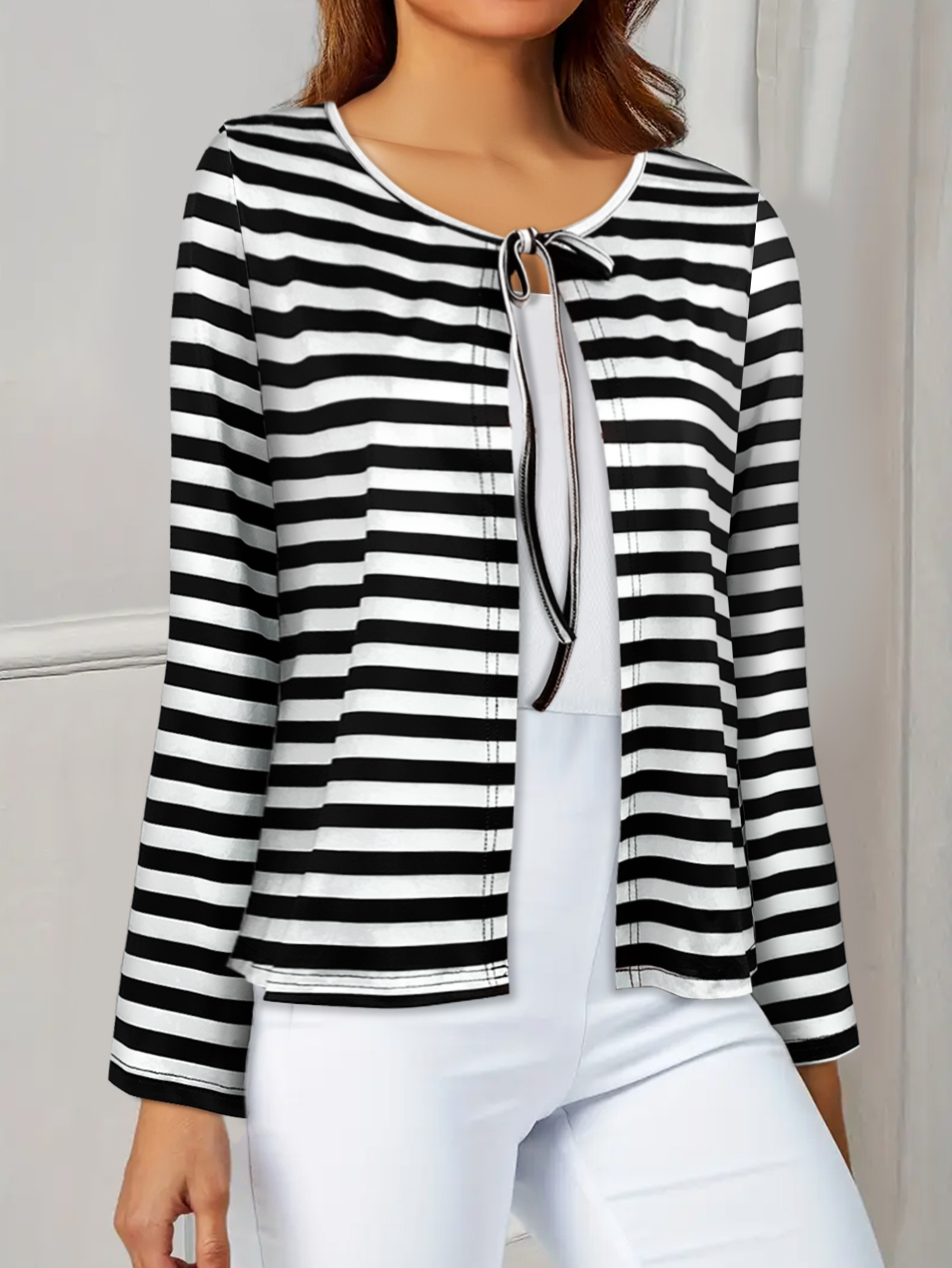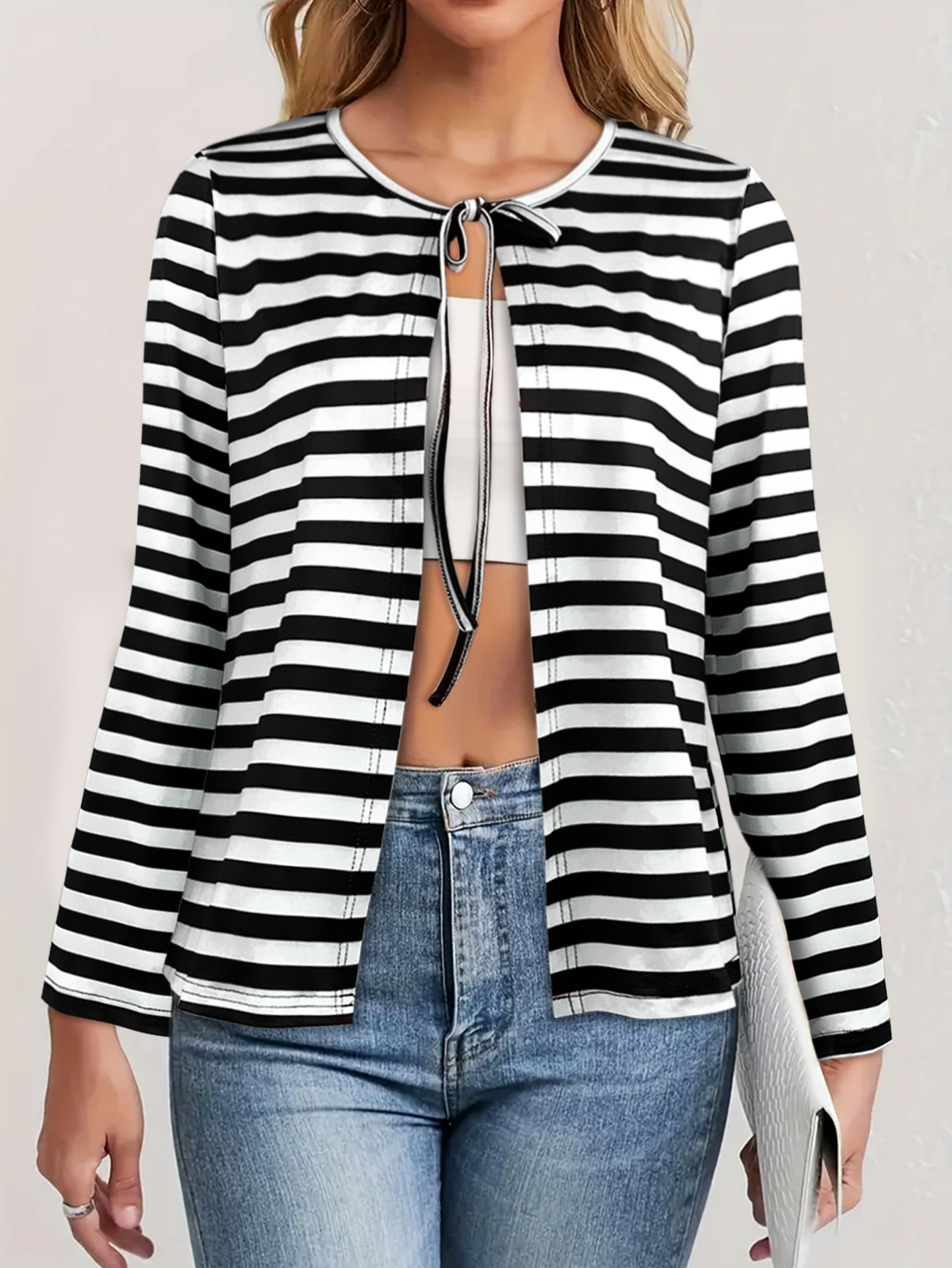 Plus Size - Plus Size, Women'S Plus-Size Elegant Long Sleeve Cardigan - Tie-Up Front, All-Over Black & White Horizontal Lines, Open Front Closure, Non-Stretchy Fabric for Fall/Winter Layering - Office, Party, Everyday Outfits - Women'S Sweater, Cardigan Sweater, Winter Layering Piece, Round Neckline, Durable Knitwear, Office Attire, Classic Design, Quality Stitching, Stylish Sweater, Fashion Lovers