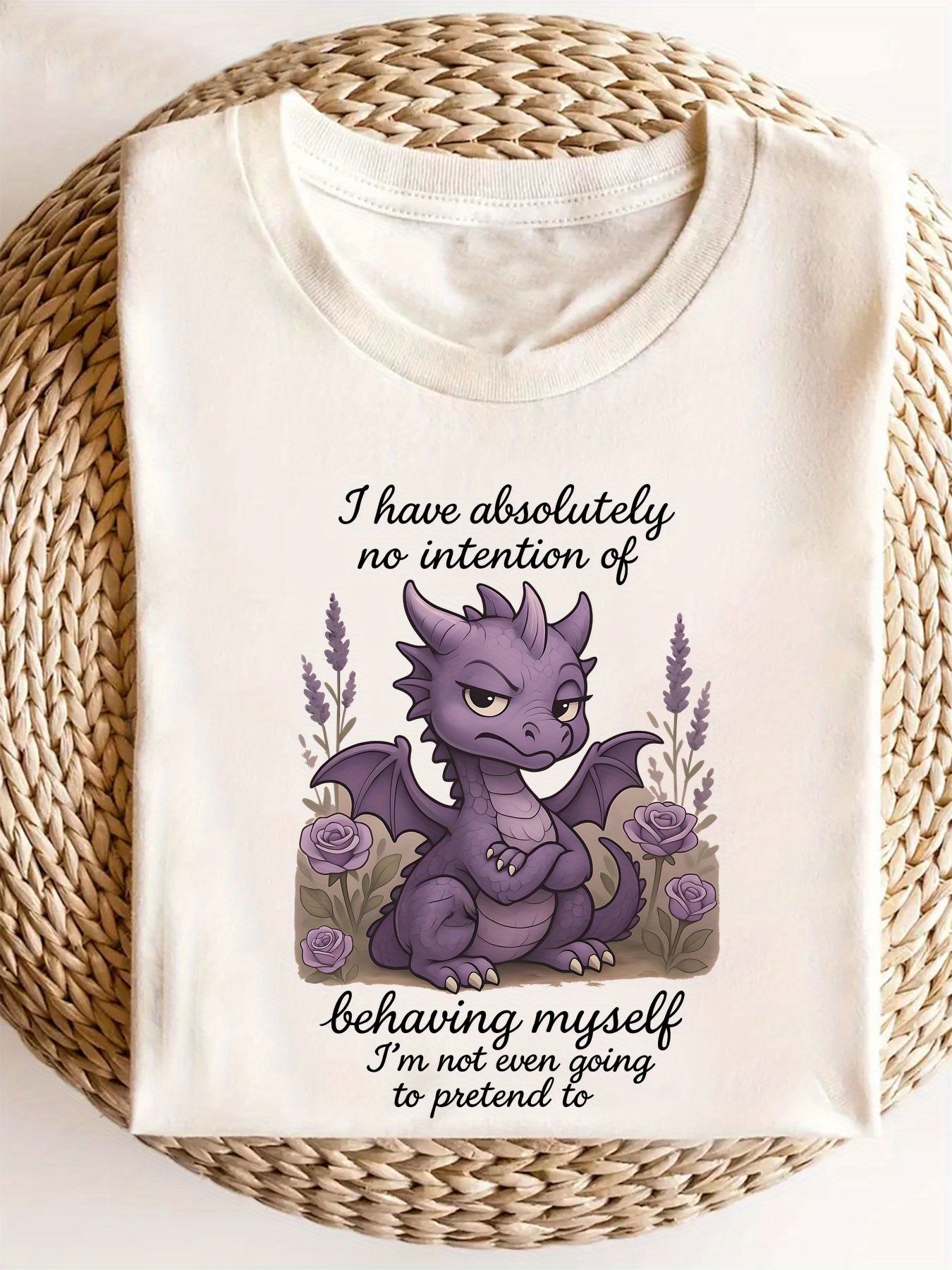 Women's Casual Short Sleeve Round Neck T-Shirt - 100% Breathable Geometric Print Tee with Purple Dragon & Floral Design, "I Have Absolutely No Intention of Behaving Myself" Slogan, Machine Washable for Spring/Summer Parties & Daily Wear
