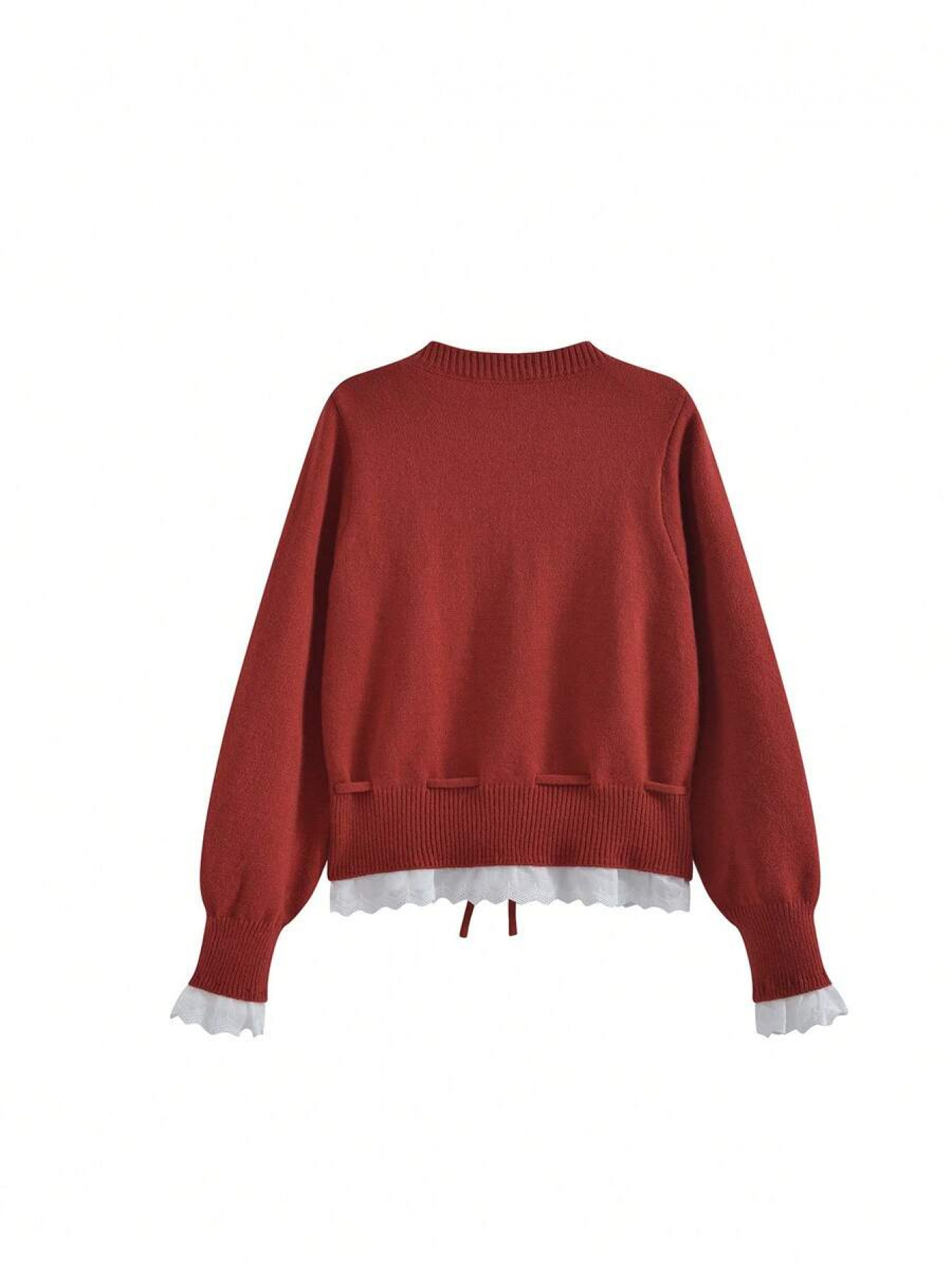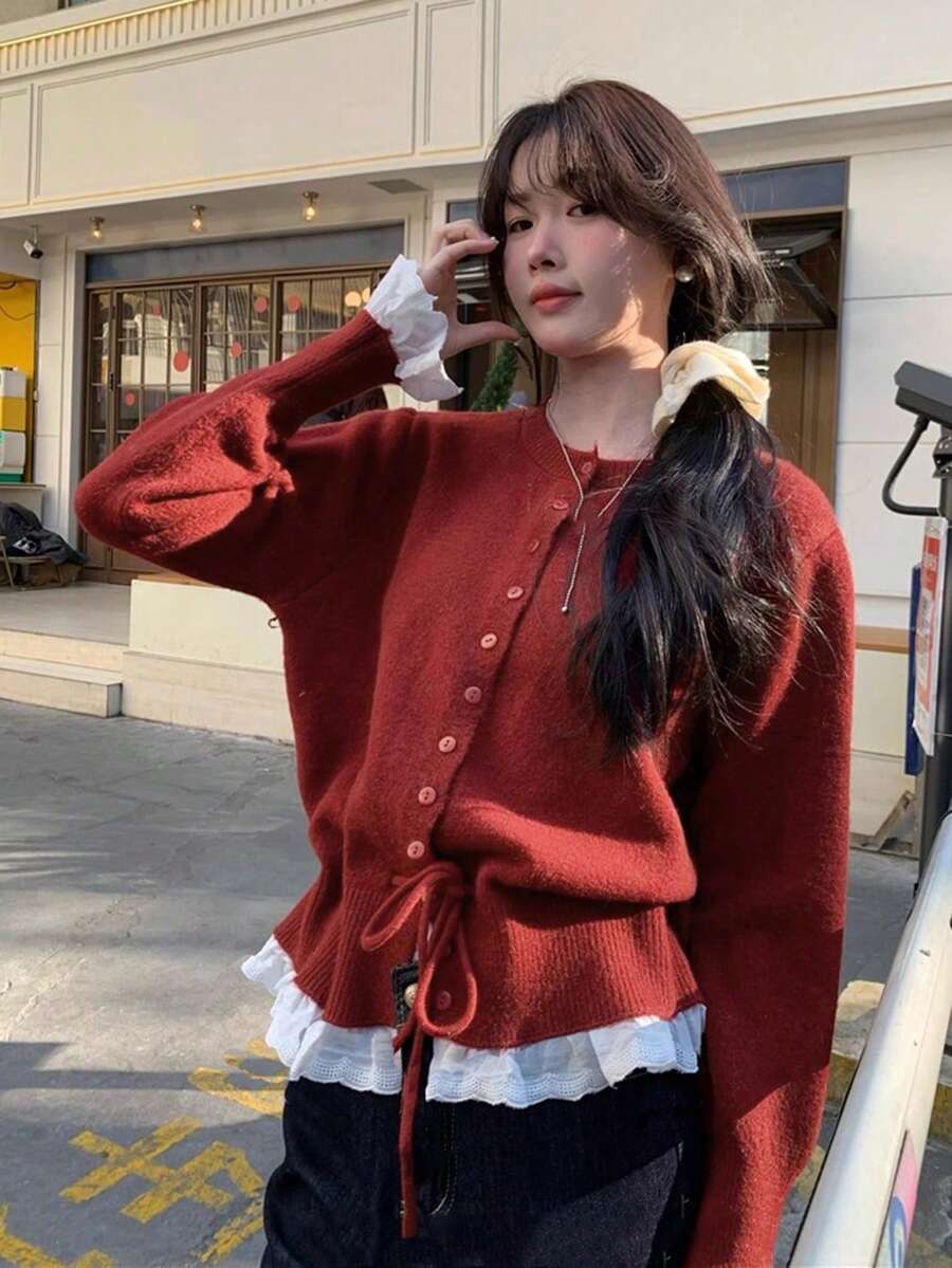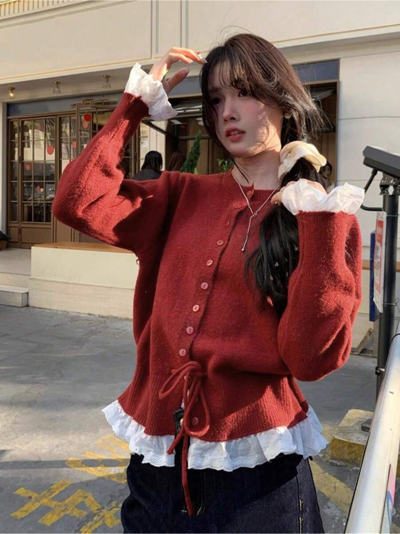 Women's Elegant Lace Patchwork & Tie Waist Loose Cardigan Sweater - Off-Shoulder/Boat Neck Jacket, Cozy Fall/Winter Outerwear, Machine Washable Layering Piece for Blouses & Trousers (Patchwork Design)
