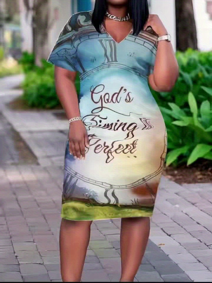 Women'S Plus Size Christian Faith-Inspired "God'S Timing Is Perfect" Dress - V-Neck Short Sleeve Casual Church Outfit, All-Over Bible Verse Print (Psalm 23:1-6), Breathable Mid-Length H-Line Silhouette, Comfortable & Versatile for Casual Attire, Worship & All Seasons - Easy Care Machine Washable Dress, Plus Size Women Dress, Women Plus Size Dress, Plus Size Women Summer Dress, Curvy Plus Dress, Dress For Women Plus Size, Plus Size Dress For Women