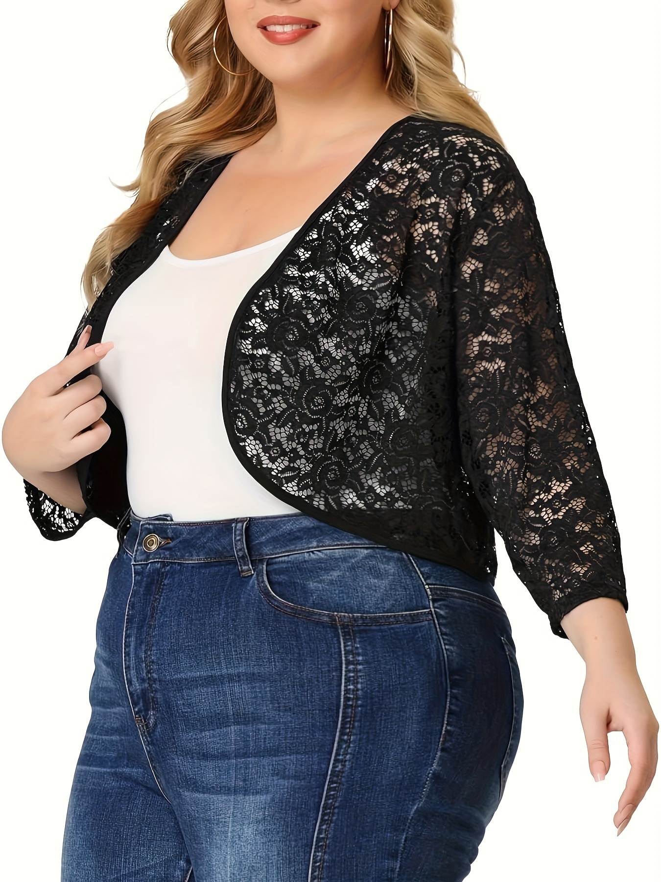 Plus Size Kimono Women Cardigan - Sheer Floral Pattern, 3/4 Sleeve, Open Front Shawl, Casual Spring/Summer Wear, Black, Elegant Event Wear, Short Length, Slight Stretch Fabric, No Lining