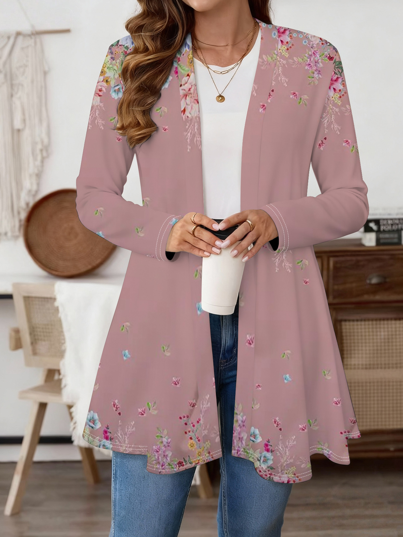 Plus Size - Plus Size, Plus Size Women'S Elegant Floral Print Cardigan - Lightweight Breathable Stretchy Long Sleeve Open Front Sweater with Pastel Pink & Multicolor Floral Design, Spring/Autumn Casual Outerwear for Women