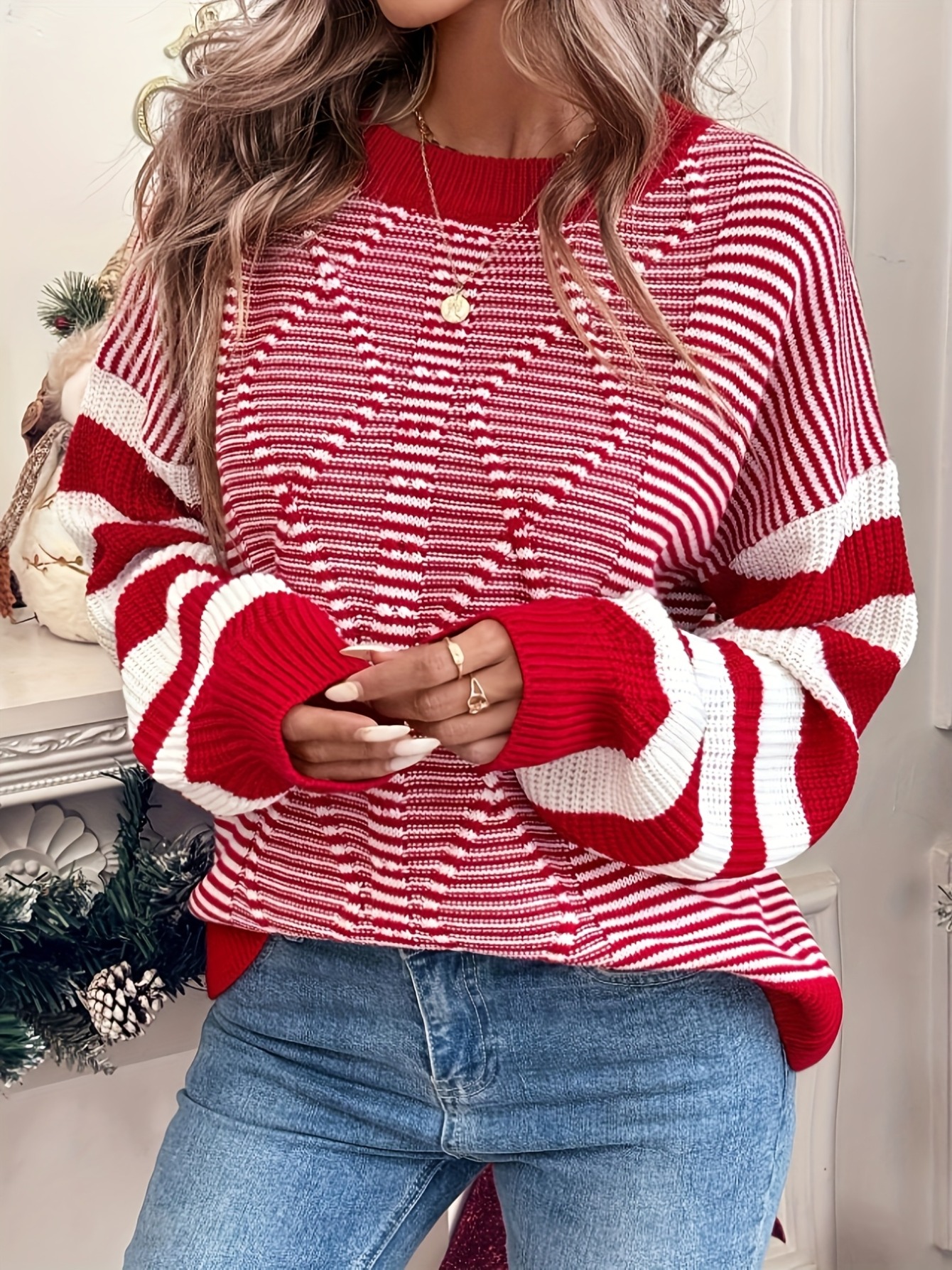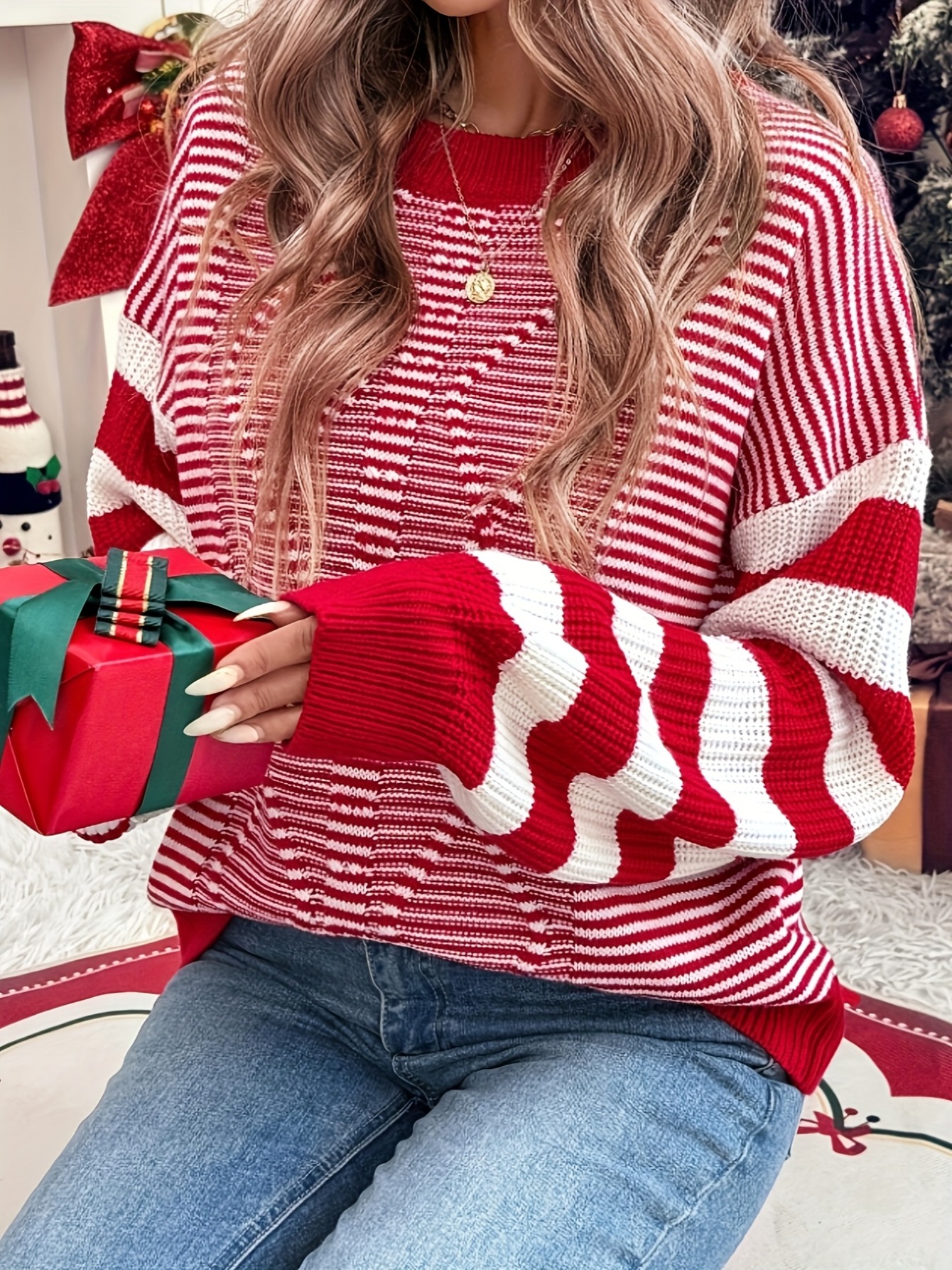 Women's Red & White Striped Sweater - Soft Stretchy Crewneck Sweater with Black Piping & Horizontal Stripes, Elegant Winter Sweater for Christmas Parties, Family Gatherings, Cozy Holiday Outfits (Pink/Beige/Brown/Navy) - Versatile