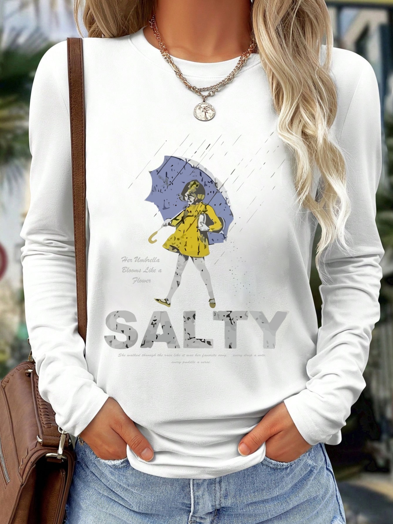 Women'S Long Sleeve T-Shirt - White Top with SALTY Graphic, Crew Neck Casual Everyday Shirt for Women, All-Season Everyday & Party Outfits - from Local Warehouse, Versatile Clothing, Playful Design, Quality Stitching, Stylish Blouse, Fashion Lovers