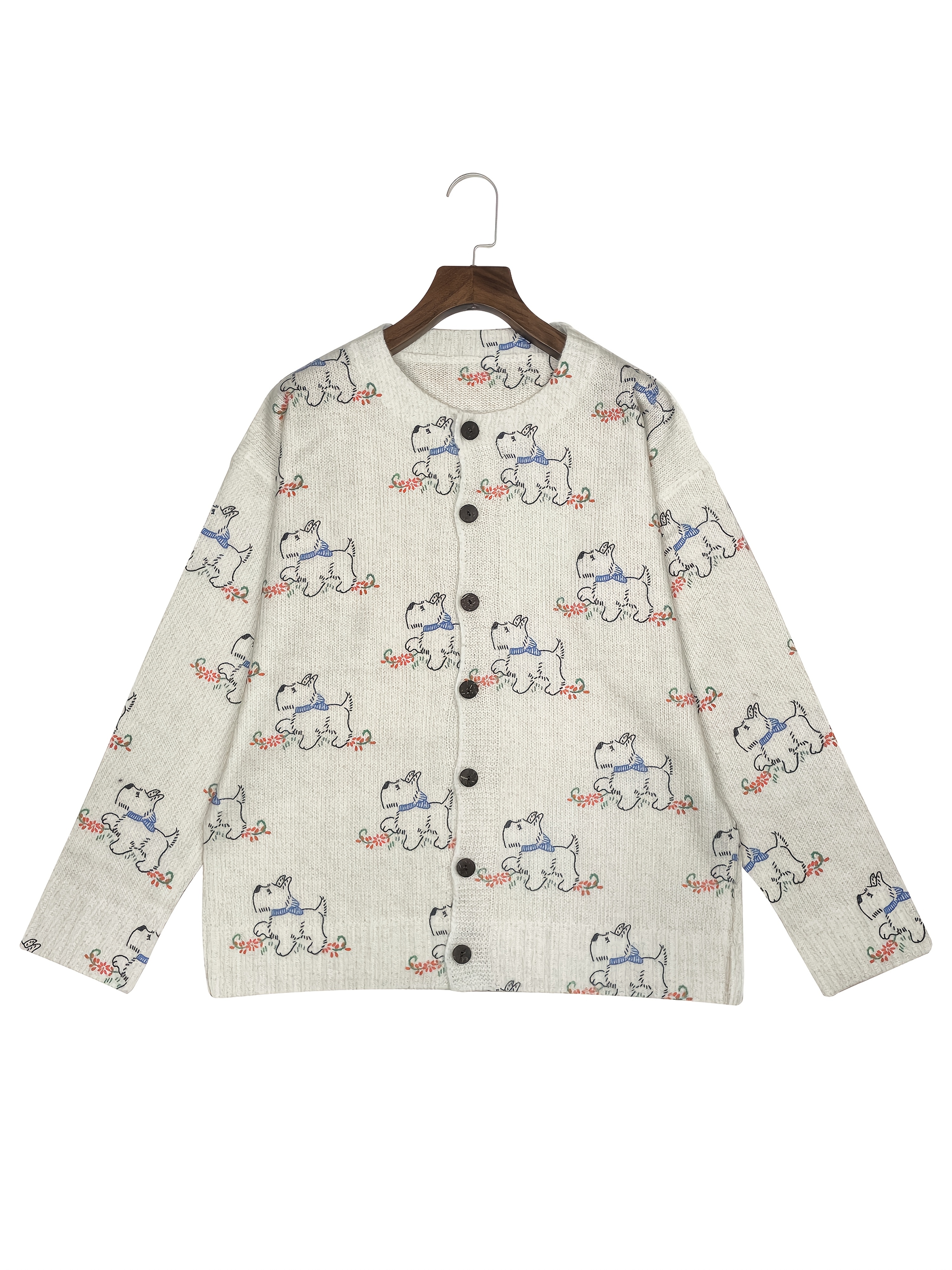 [Constructi] Plus Size Women's Elegant Dog Print Cardigan | Cozy Fall/Winter Sweater, Soft & Pug Pattern, Button Front, Long Sleeve, Round Neck, All-Over Dog Design, Casual Wear | Playful Dog Design