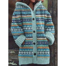 Plus Size, 2D FLAT PATTERN Soft Jacquard Glacier Snow Mountain Hooded Cardigan, Elegant, Fashionable, Comfortable, Casual And Retro Hooded Coat