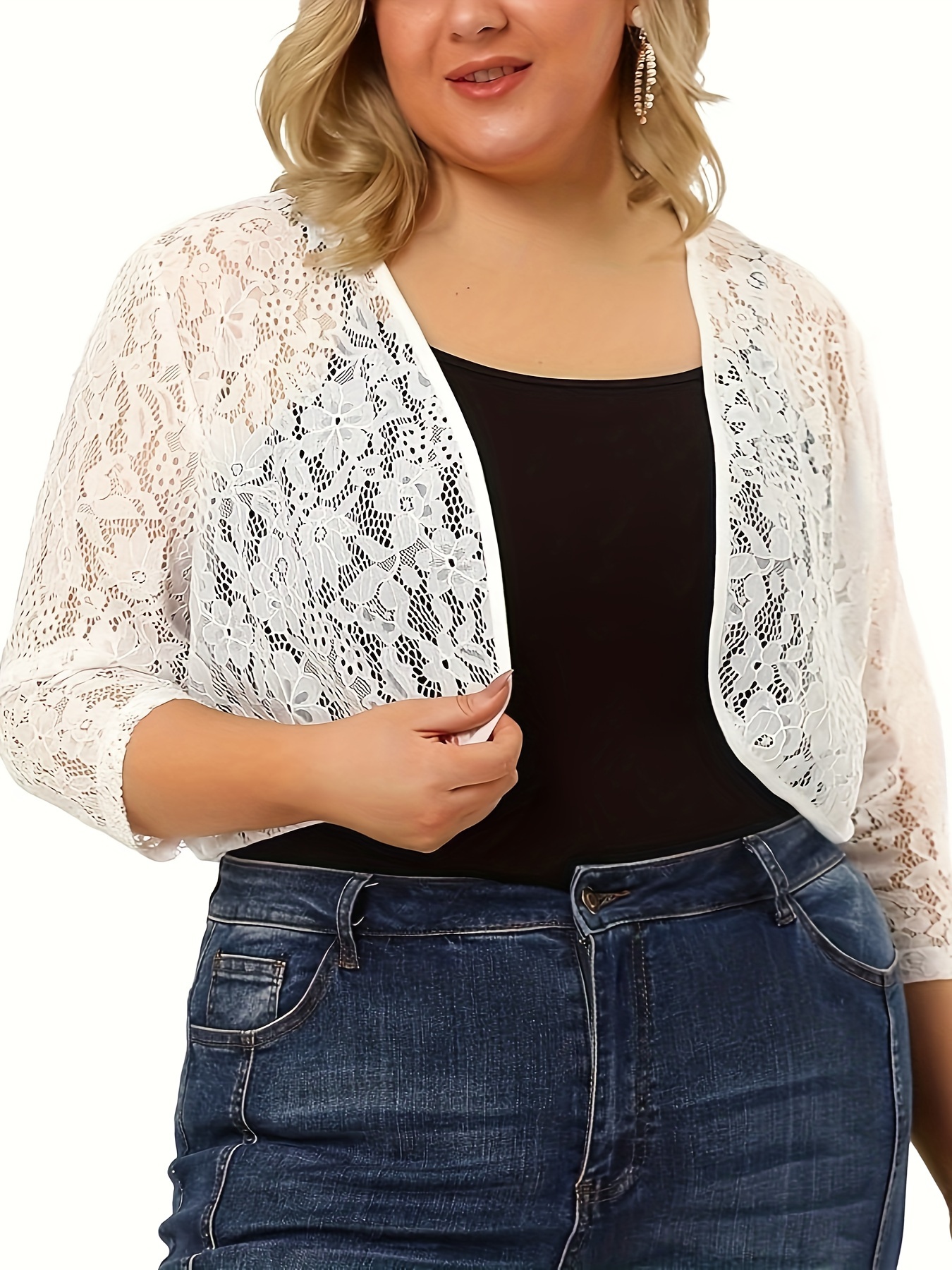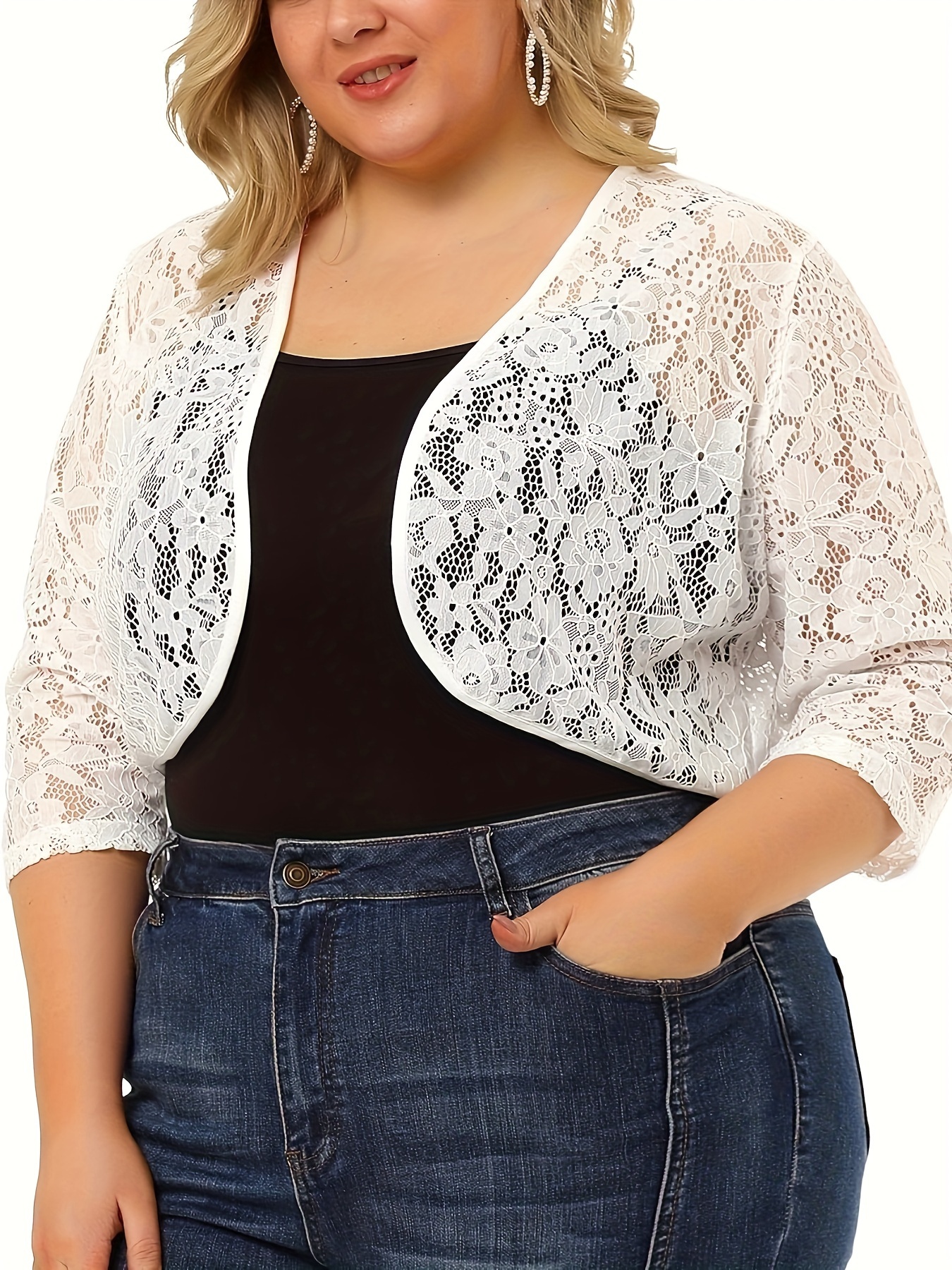 Plus Size Kimono Women Cardigan - Sheer Floral Pattern, 3/4 Sleeve, Open Front Shawl, Casual Spring/Summer Wear, Black, Elegant Event Wear, Short Length, Slight Stretch Fabric, No Lining