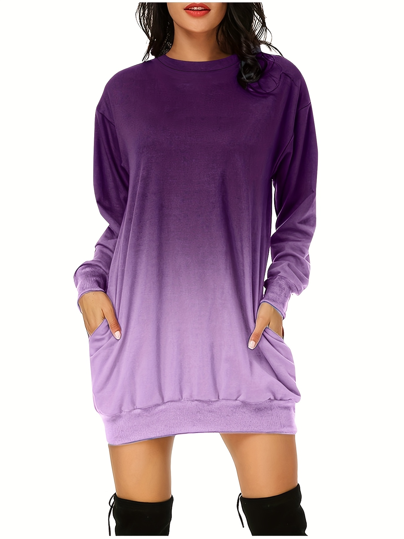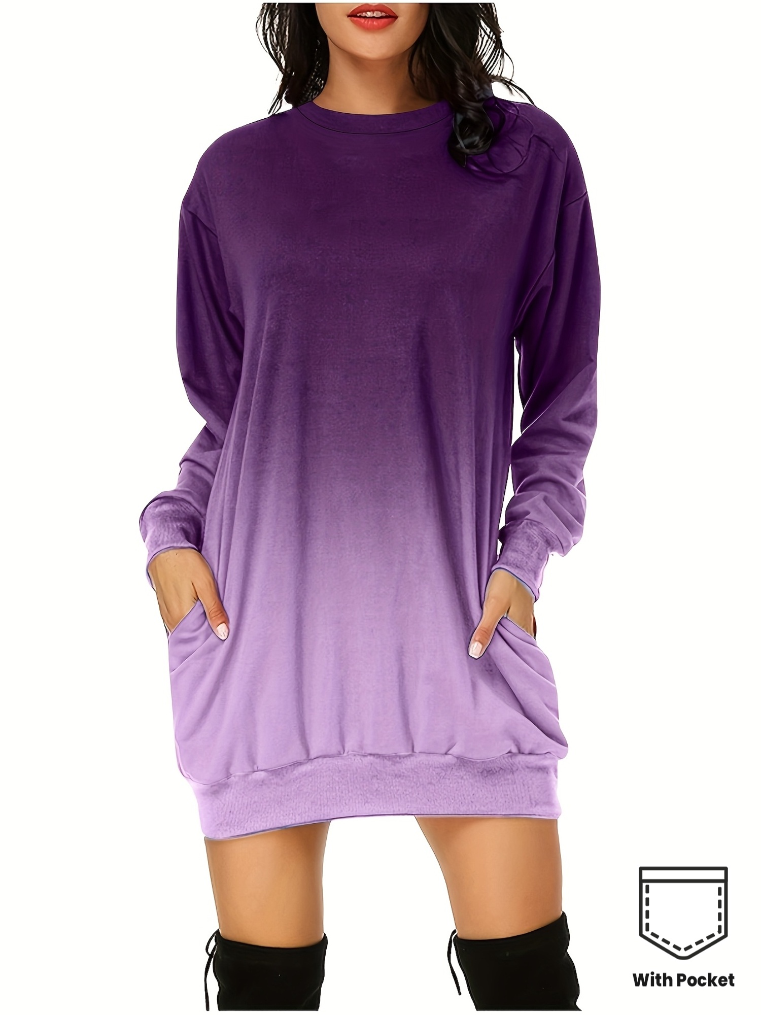 Women'S Plus Size Casual Long Sleeve Pullover Dress - Solid Purple Midi Length A-Line Silhouette with Crew Neck, Slight Stretch Fabric, Cozy Fall/Winter Dress with Pocket Detail & Smooth Texture for Everyday & Semi-Formal Wear - Easy-Care Versatile