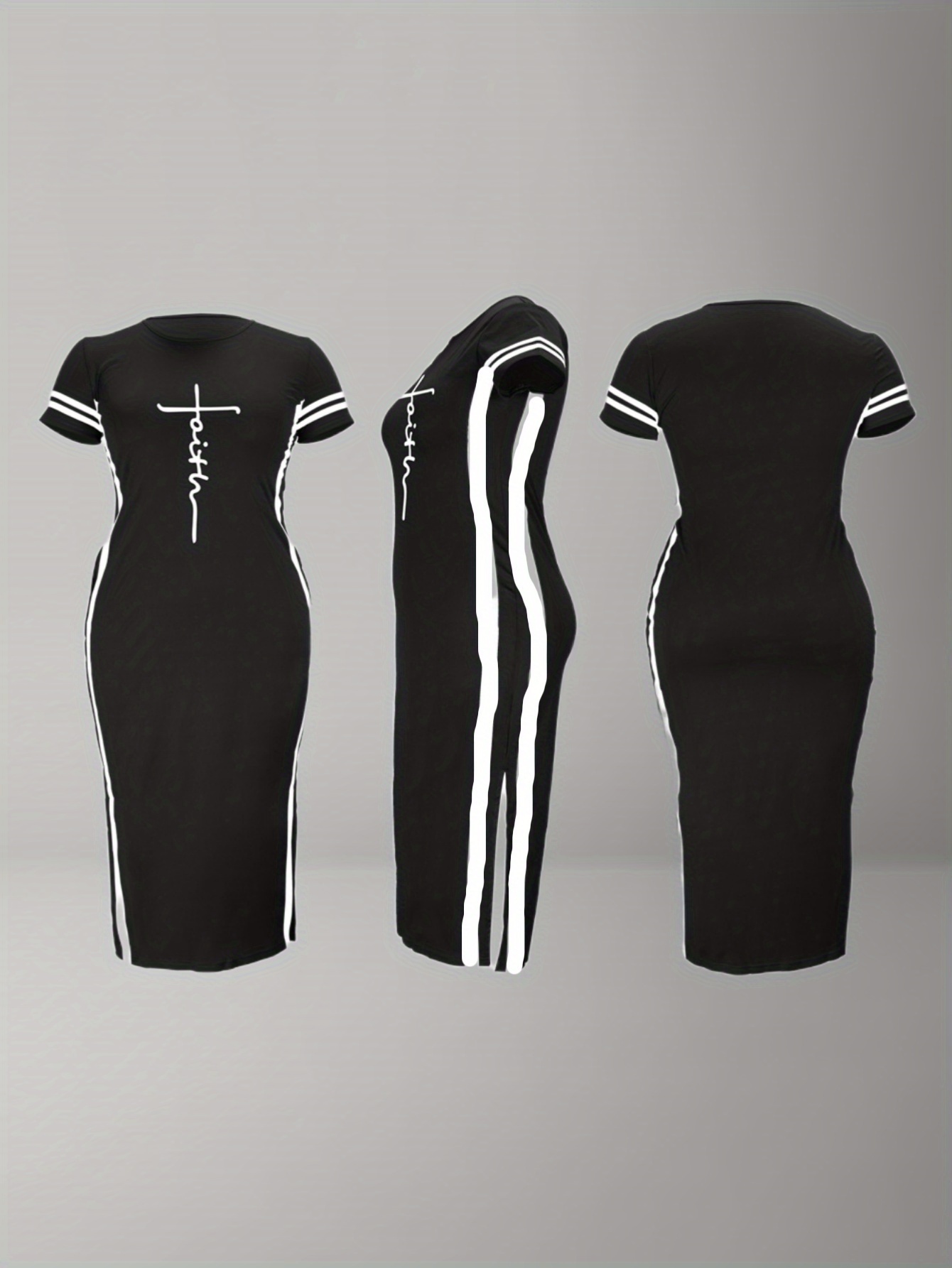 Plus Size "Faith" Letter Printed Maxi Dress L-5XL Women'S Striped Casual Long Dresses With Side Slit Round Neck Short-sleeved Dress, Spring And Summer Ladies Split Hem Bodycon Maxi Dress Striped Trim Split Slim Fit Longline Dress For Fall