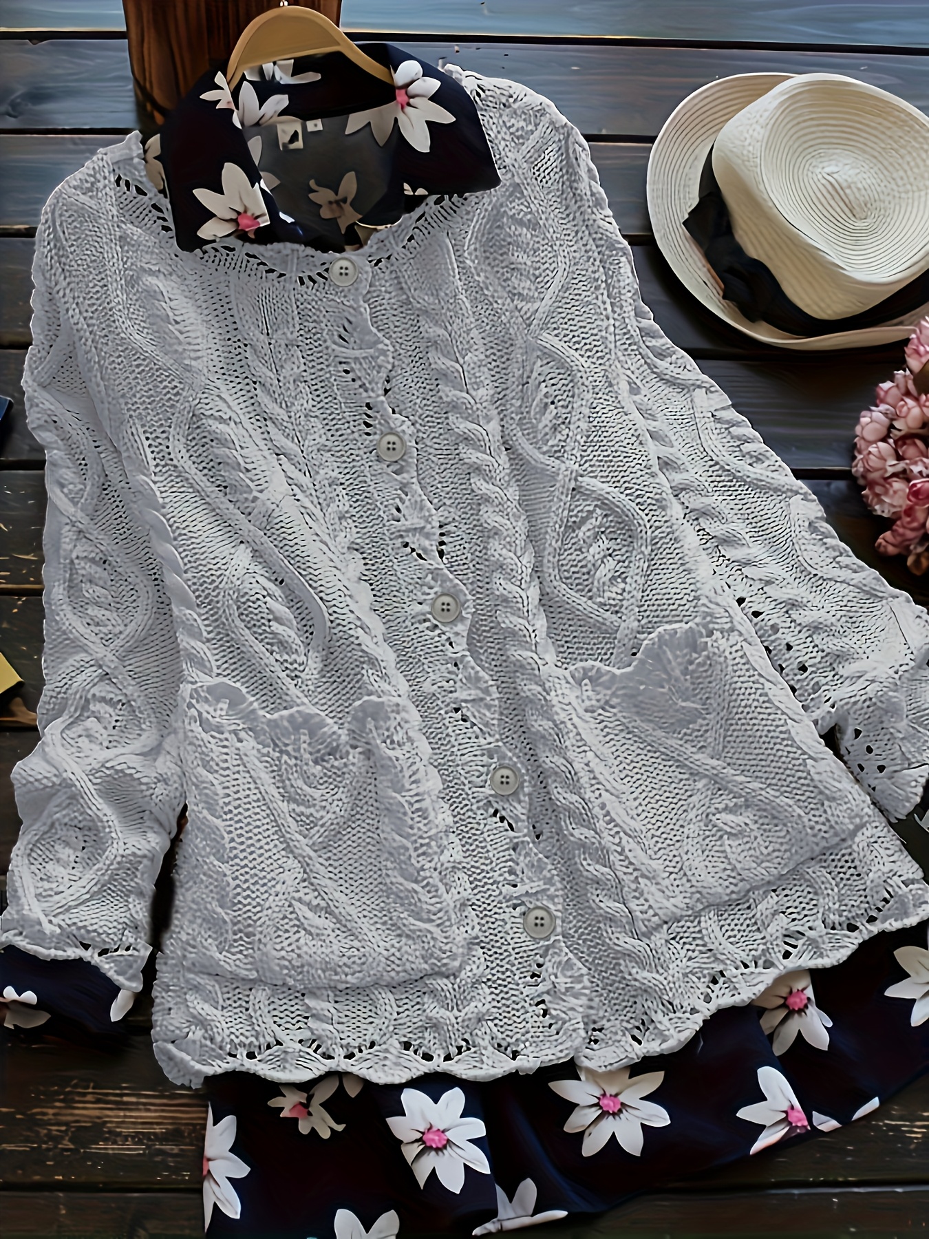 Plus Size, Plus Size Women's Casual Open Front Sweater, Long Sleeve with Pocket and Buttoned Scallop Hem