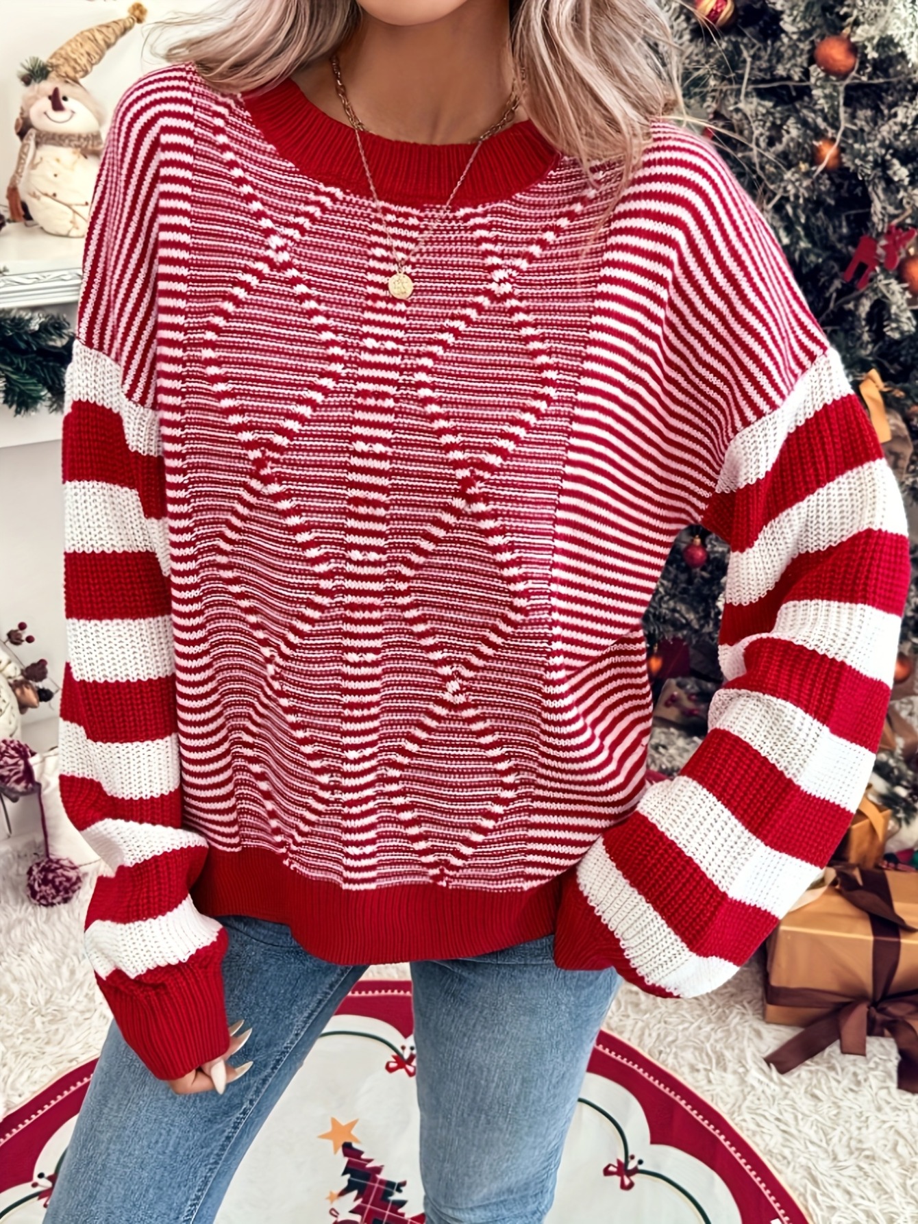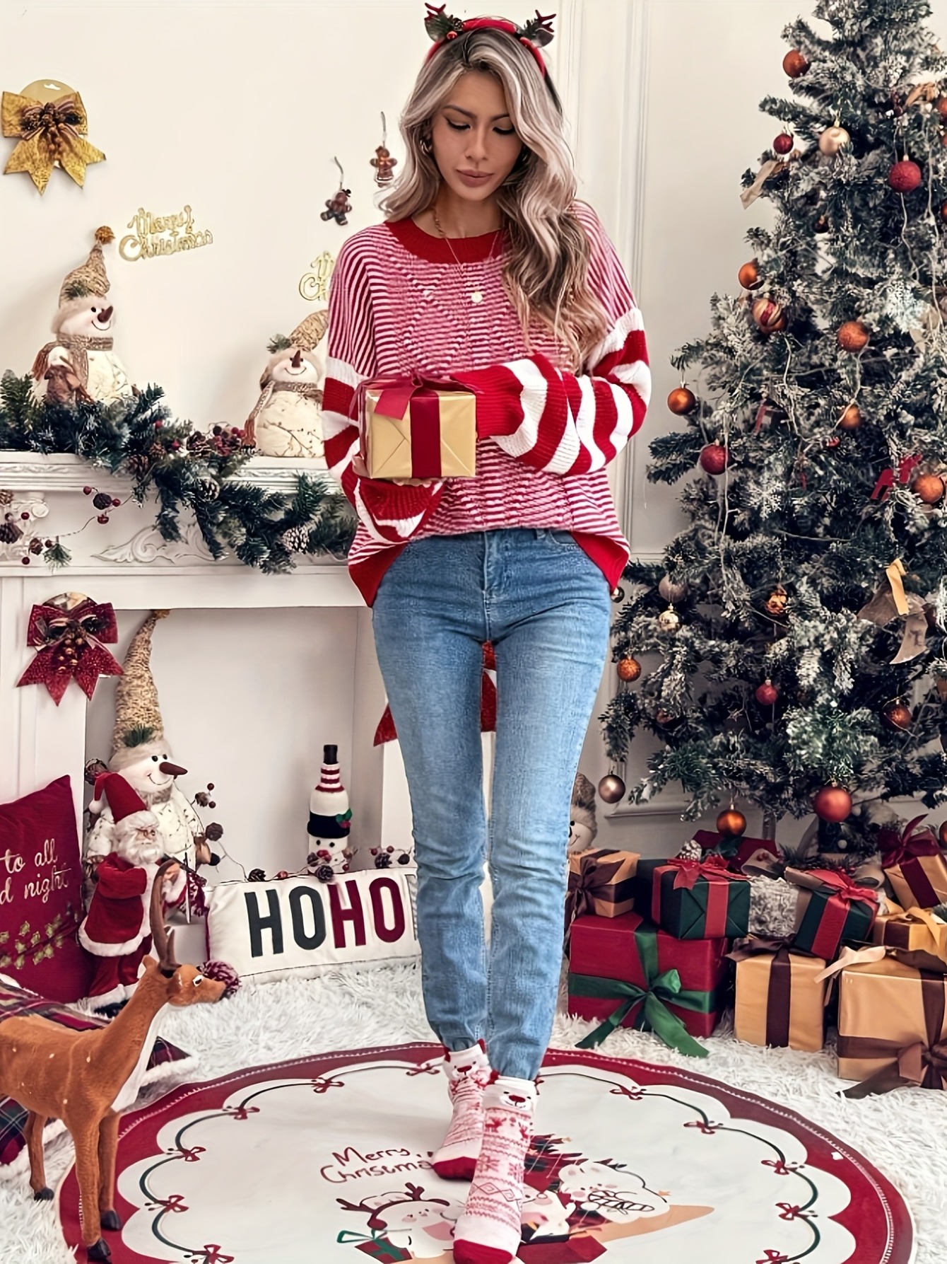 Women's Red & White Striped Sweater - Soft Stretchy Crewneck Sweater with Black Piping & Horizontal Stripes, Elegant Winter Sweater for Christmas Parties, Family Gatherings, Cozy Holiday Outfits (Pink/Beige/Brown/Navy) - Versatile